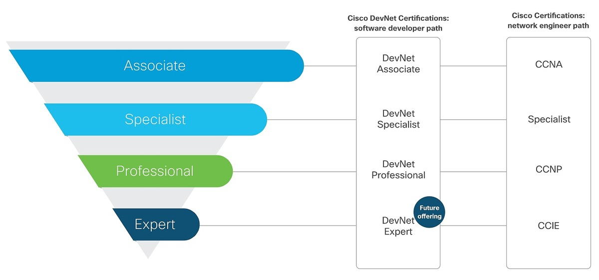 Tương tự chứng chỉ Network, ứng viên DevNet cũng được đào tạo ở 4 cấp độ Associate, Professional, Specialist và Expert. Yêu cầu khả năng của ứng viên được chi tiết tại website của Cisco. Riêng cấp độ DevNet Expert, Cisco sẽ công bố sau.