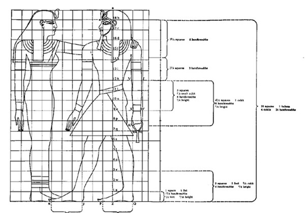 Ngoài ra, người Ai Cập cũng đã sáng tạo ra một thang tỉ lệ, kẻ ô vuông, lấy cơ thể của con người làm điểm xuất phát: chiều dài của bàn tay người bằng 2 ô vuông. Chiều cao của thân thể con người bằng 18 ô vuông.